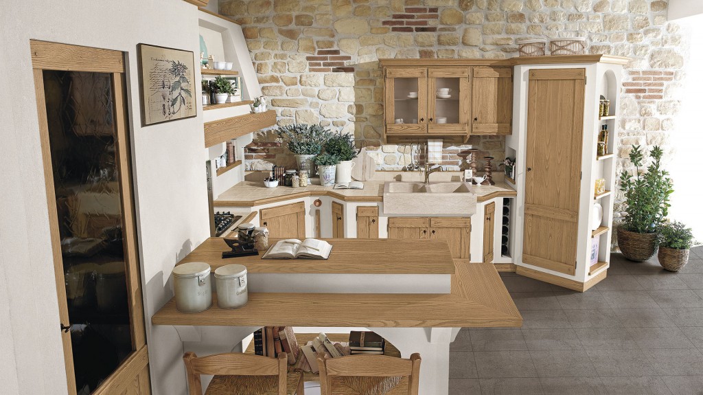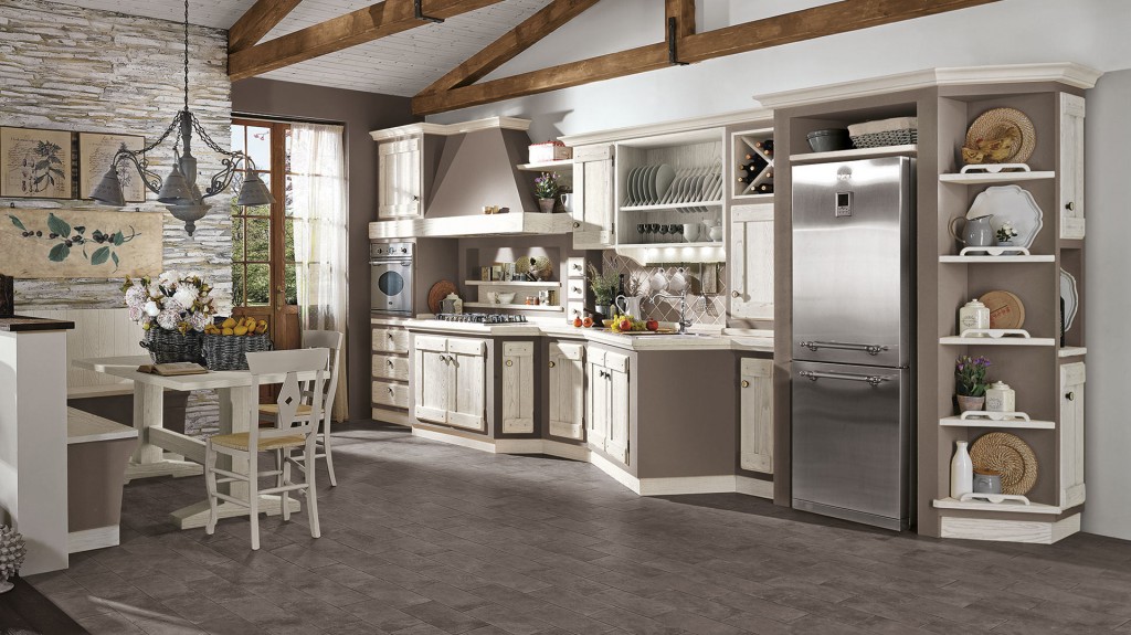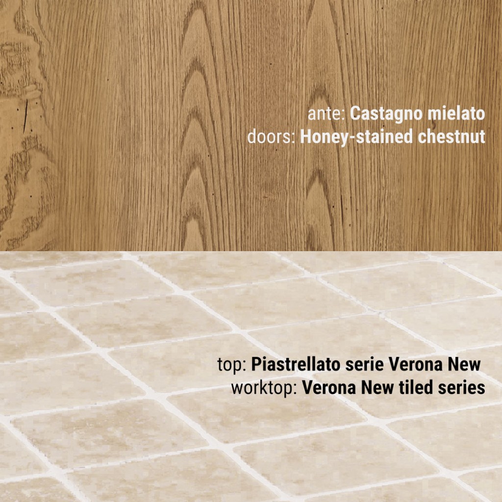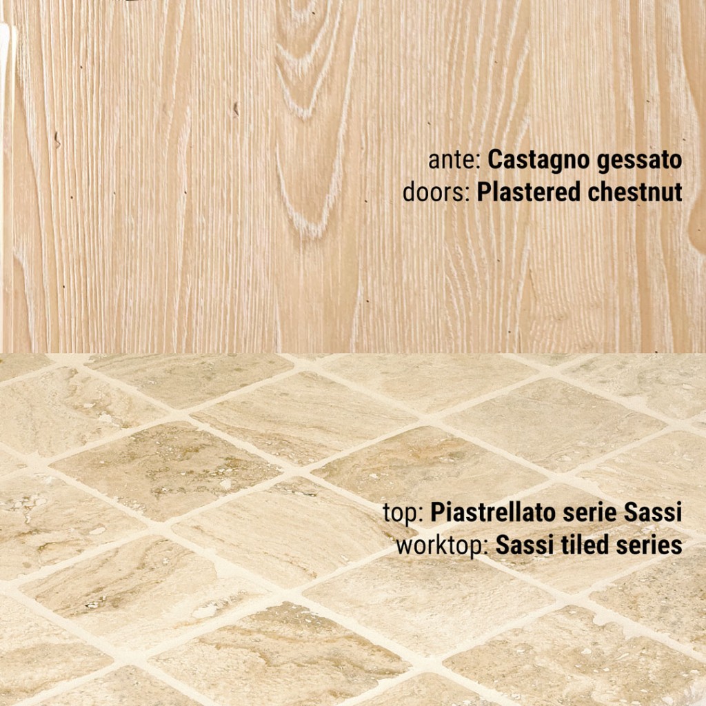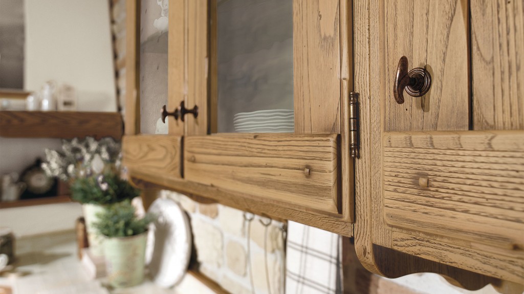 Anita, cucina in finta muratura, è realizzata interamente in legno di castagno anticato e spazzolato. L’anta si presenta con uno spessore di 32 mm, pannello centrale liscio, telaio con motivo a listoni sovrapposti, fissati lateralmente da finti chiodi. Le venature del legno percorrono il pannello centrale dell’anta in senso verticale, mentre si alternano nel telaio, creando così un leggero movimento che, per effetto dei processi di spazzolatura ed anticatura, permette di apprezzare ancor più la bellezza del castagno. Anita riporta alla memoria le suggestioni di un passato fatto di cose concrete che continuano a rivivere in tutti coloro che scelgono la sua semplicità e bellezza.