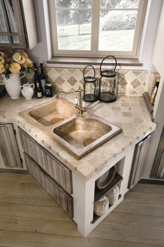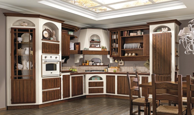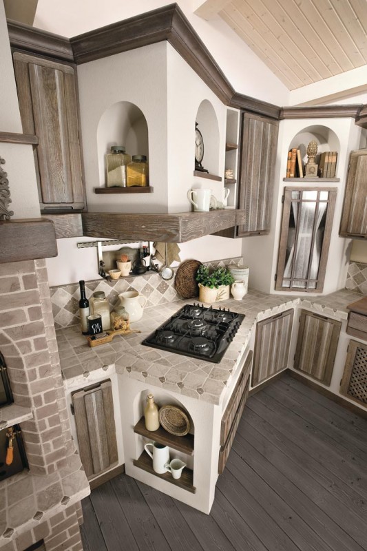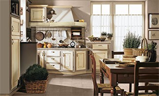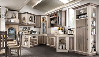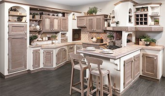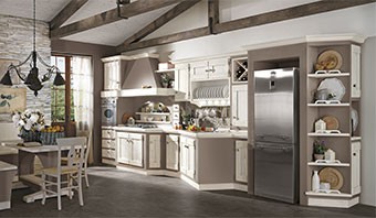 Una cucina in finta muratura e massello di frassino ricorda gli ampi spazi delle cucine rustiche dei casali di una volta. Propone un’anta di forte spessore caratterizzata da doghe verticali a rilievo. La maniglia è ricavata nel telaio dell’anta, valorizzata così dalla sola presenza del legno, le cui venature emergono piacevolmente grazie al particolare effetto anticato. Elena propone anche un’anta vetro con telaio all’inglesina che, in abbinamento con l’anta dogata, celebra gli antichi sapori dei tempi passati.