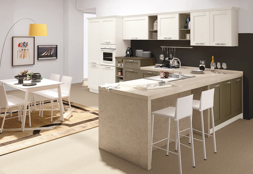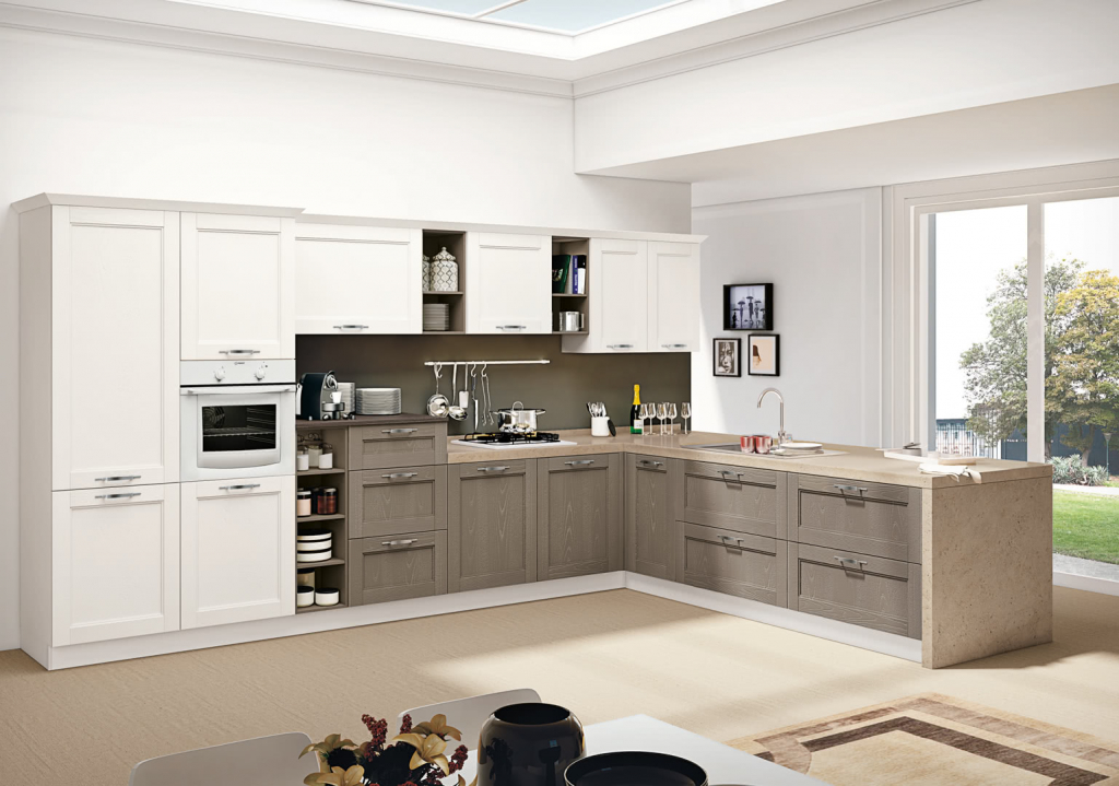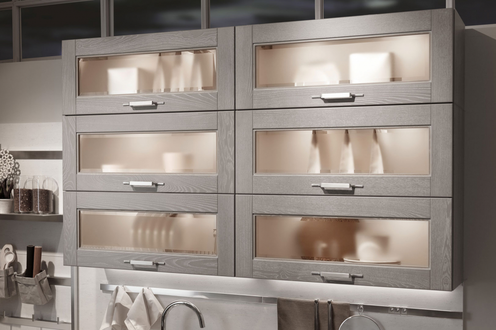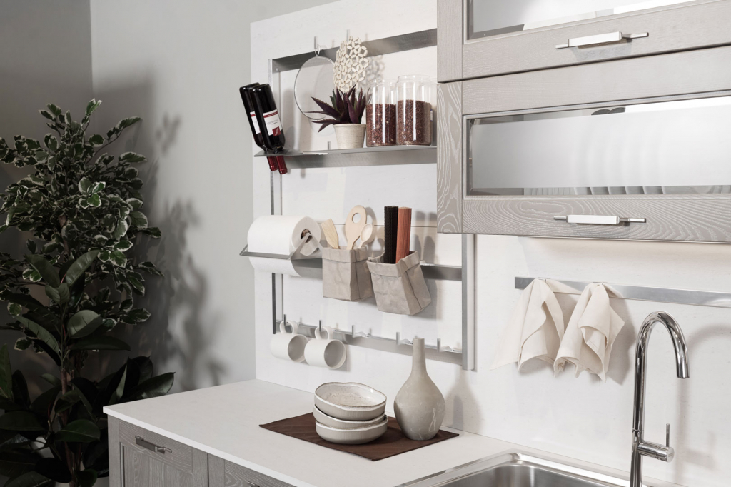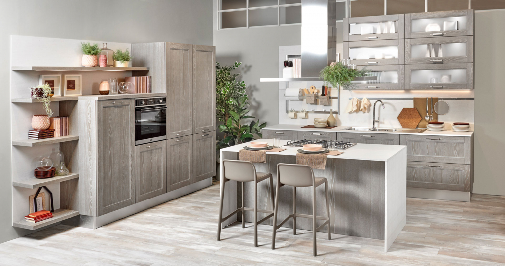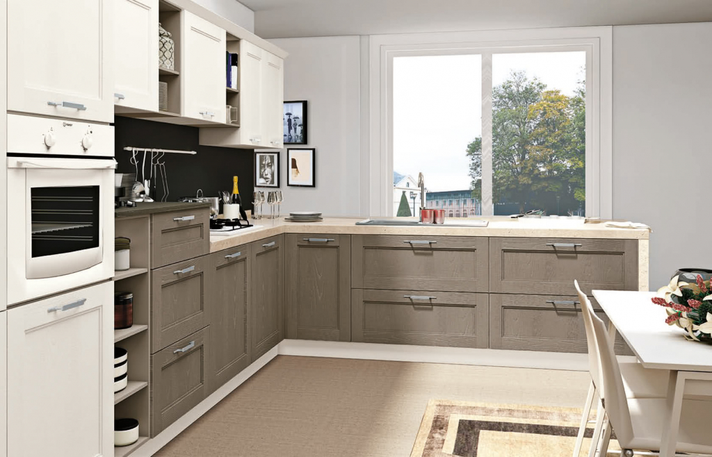 Questa cucina propone un richiamo alle forme più classiche con sensazioni materiche che si fondono in nuance decise e creano l’atmosfera giusta per rilassarsi. Basi con ante in frassino laccato grigio invecchiato, colonne e pensili con ante in frassino laccato bianco camelia a poro aperto.