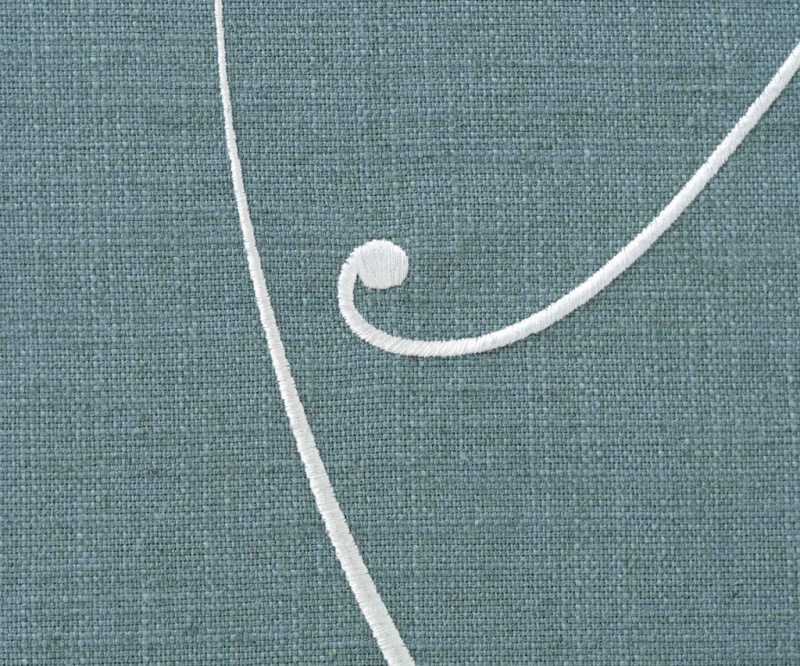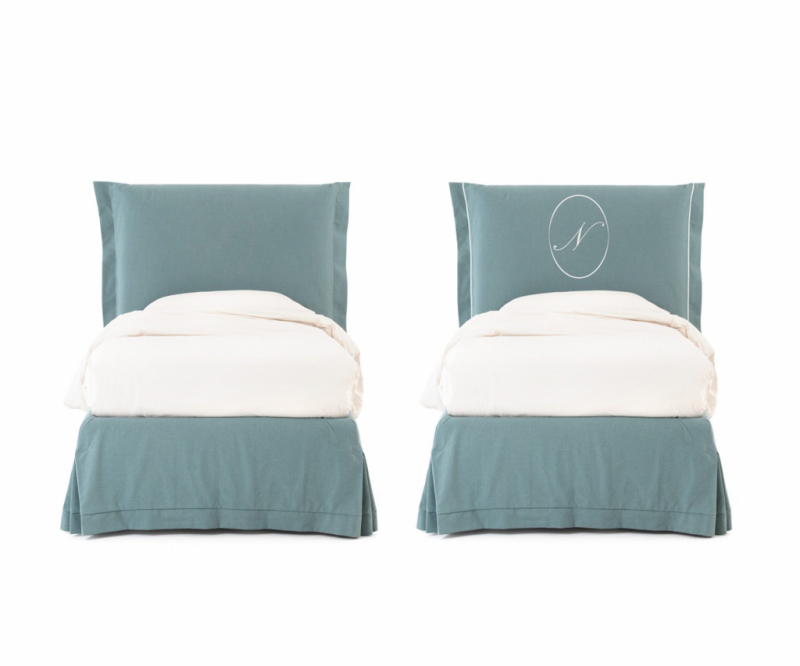 Nella versione Romantic, il letto Chloè è arricchito da un ricamo a bacchetta al centro della testata, realizzato in contrasto con il tessuto. La coda di topo che rifinisce il bordo volant della testata è dello stesso colore del ricamo. Le iniziali, personalizzabili al