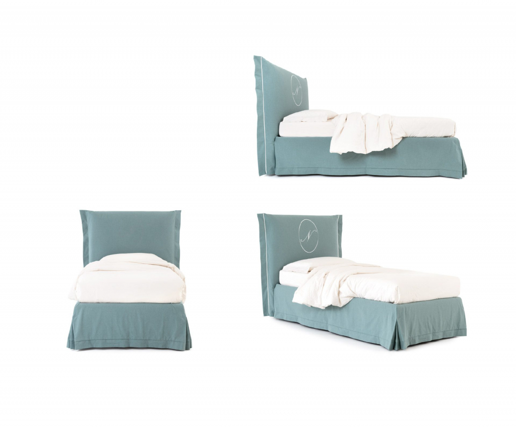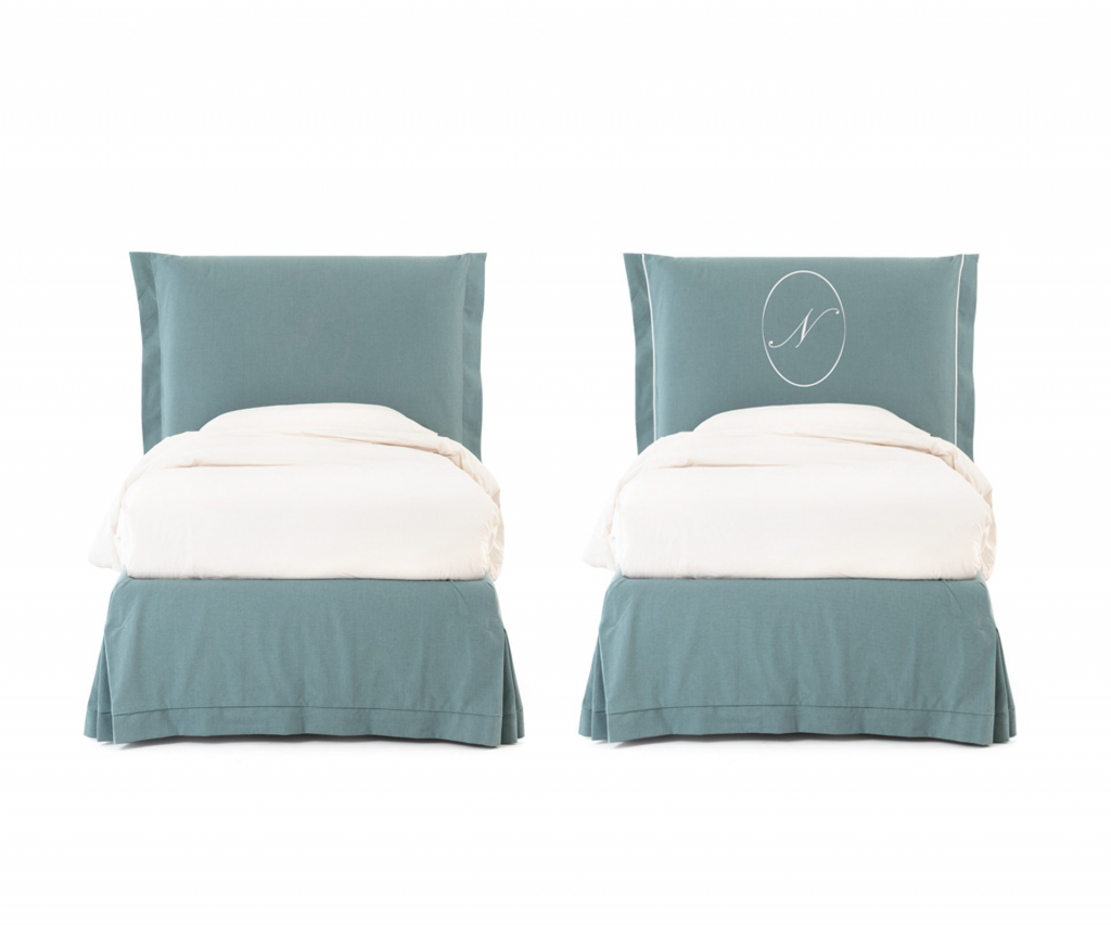 Nella versione Romantic, il letto Chloè è arricchito da un ricamo a bacchetta al centro della testata, realizzato in contrasto con il tessuto. La coda di topo che rifinisce il bordo volant della testata è dello stesso colore del ricamo. Le iniziali, personalizzabili al