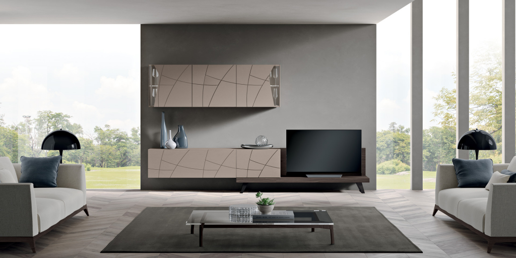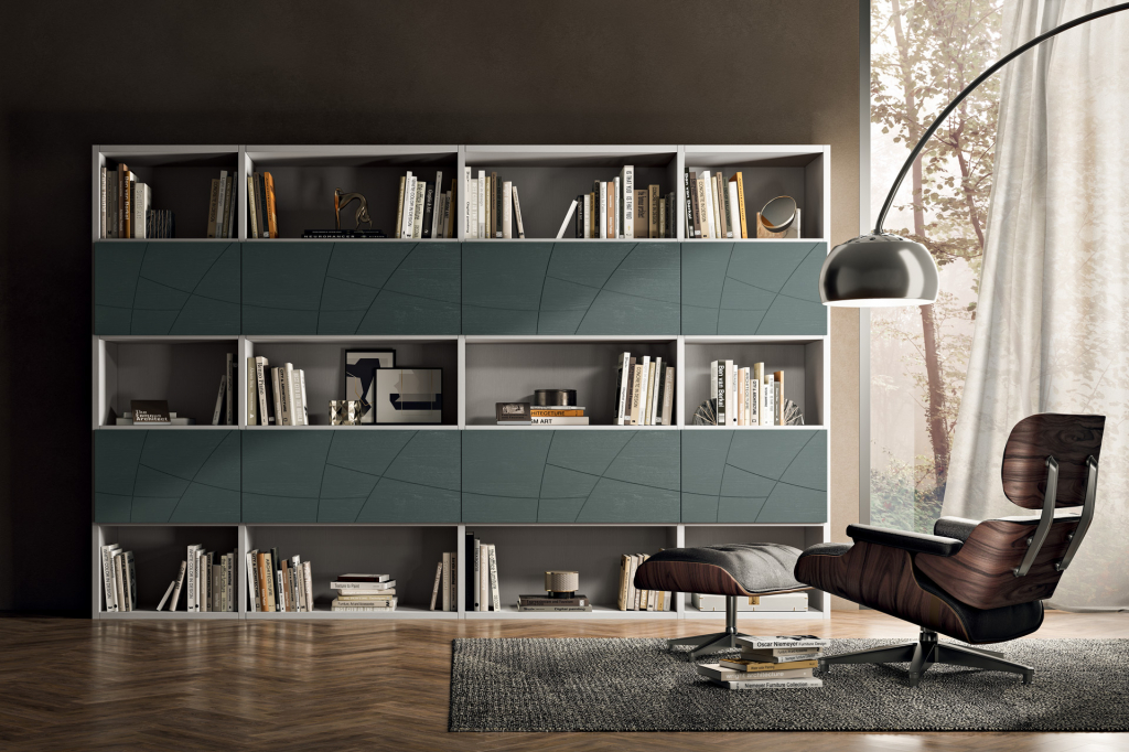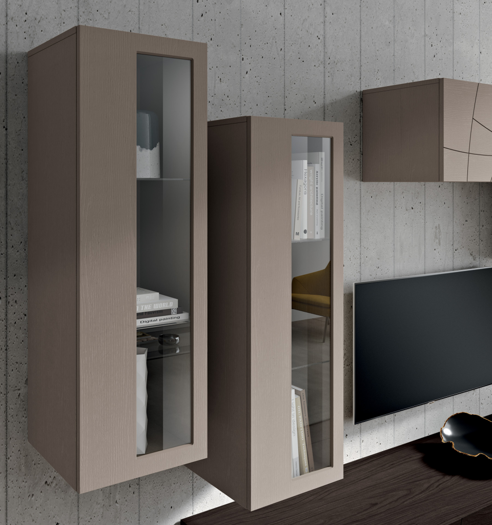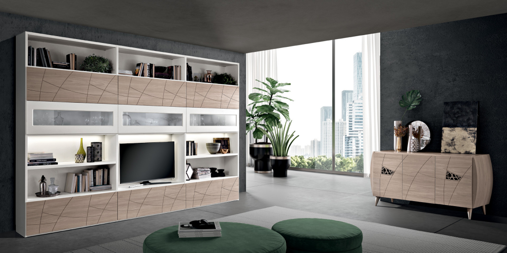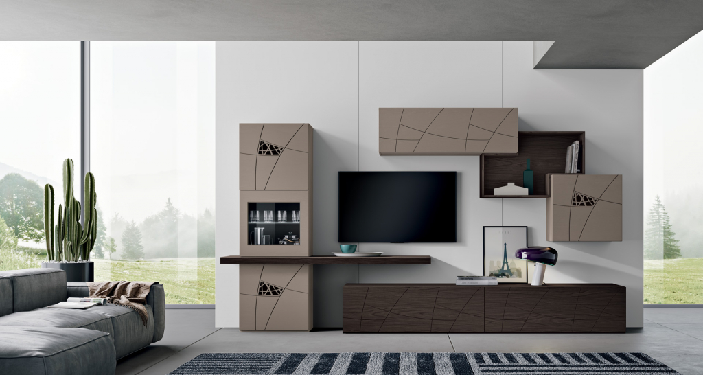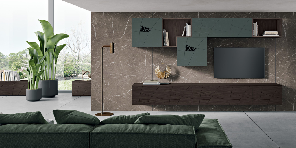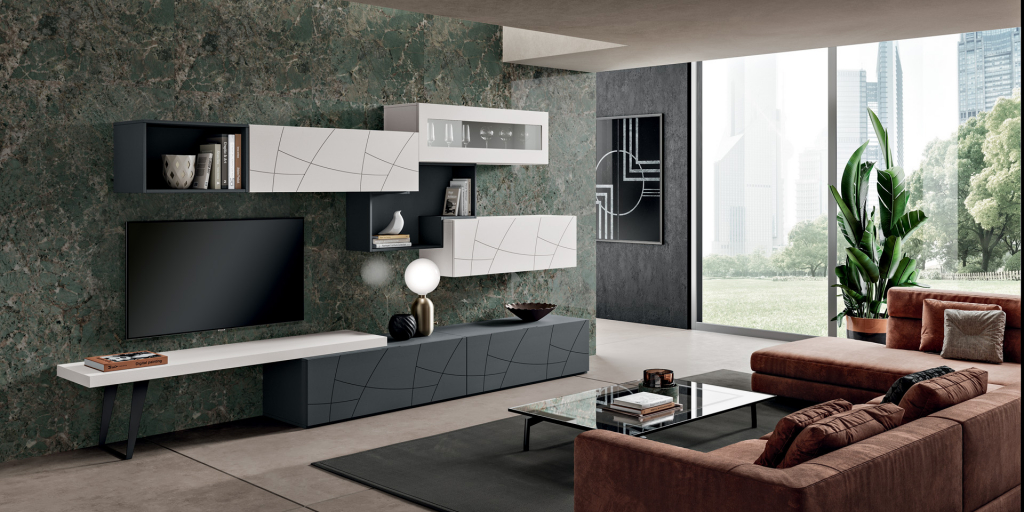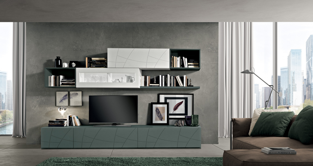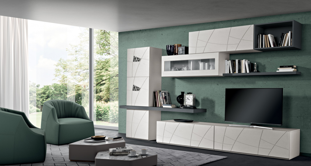 Lapis è un soggiorno caratterizzato dalle delicate invcisioni dei frontali che creano movimento e contrasto, con mensole, piani sospesi e pensili originali