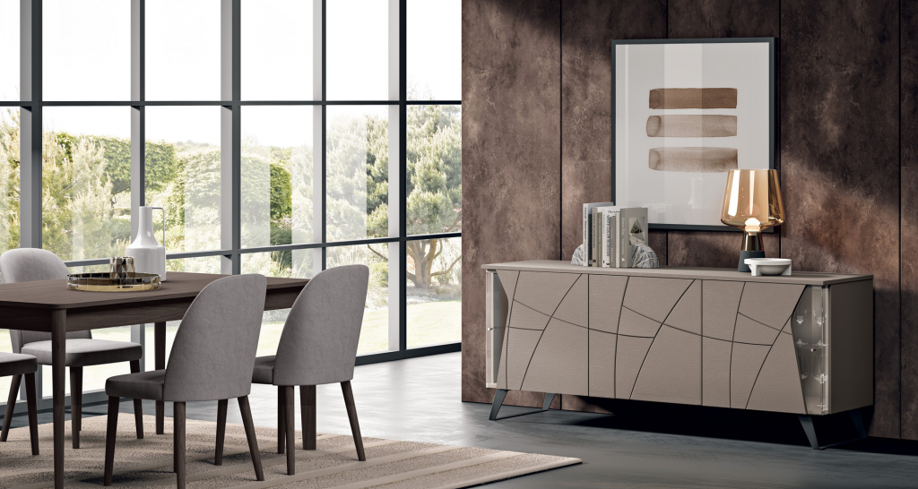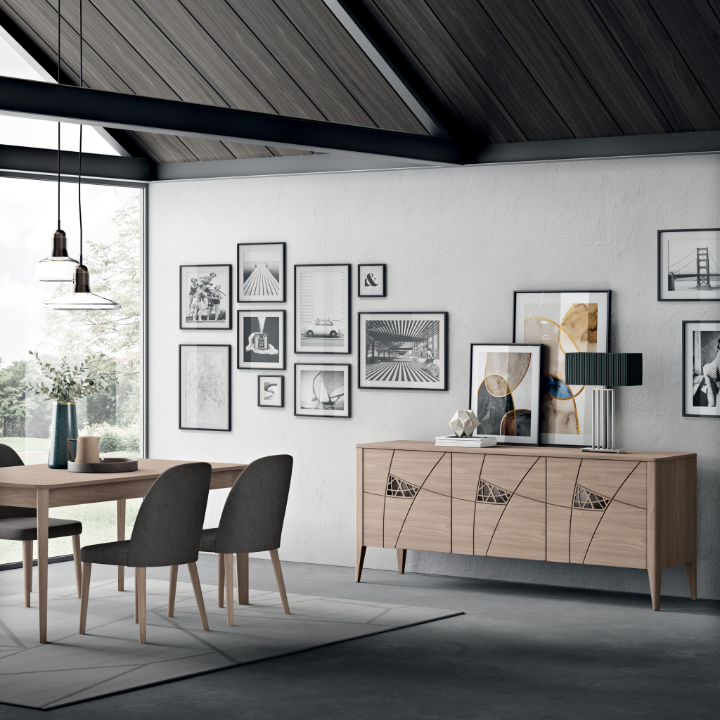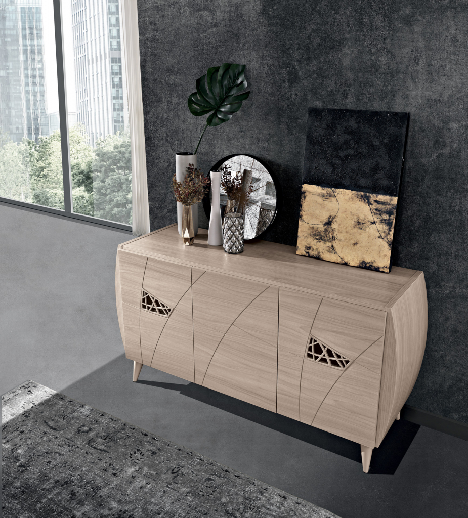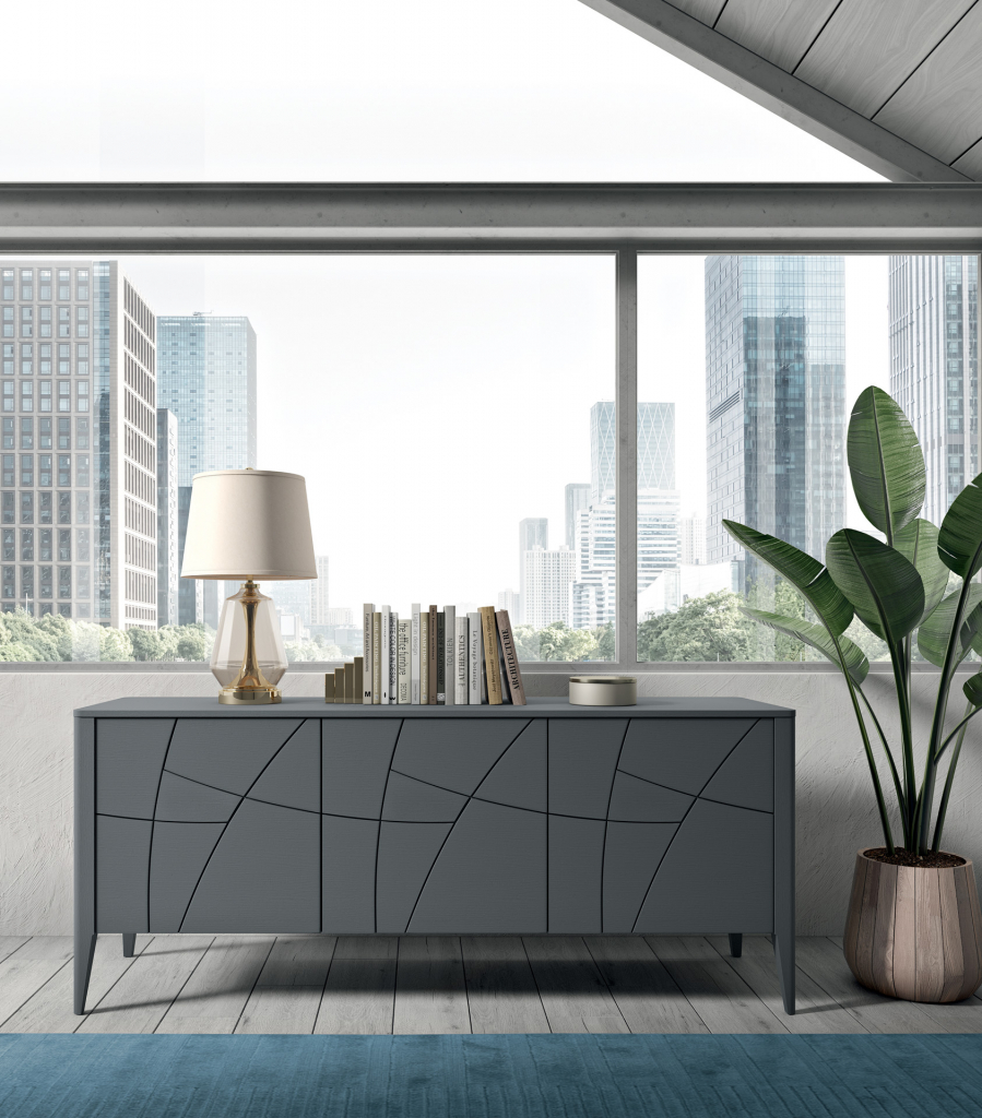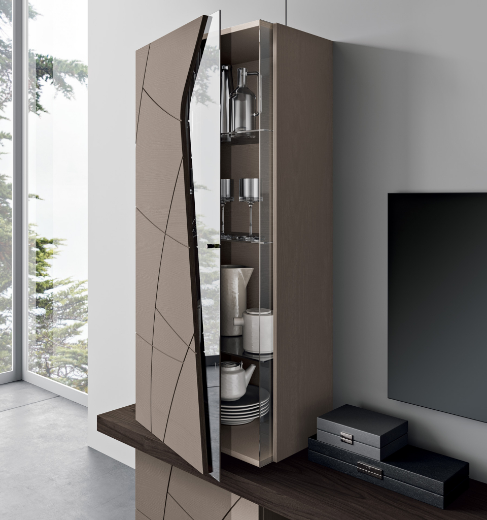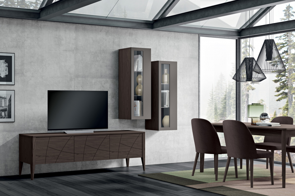 Lapis è un soggiorno caratterizzato dalle delicate invcisioni dei frontali che creano movimento e contrasto, con mensole, piani sospesi e pensili originali